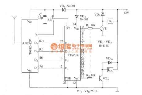 As the figure shows, the 16-channel remote control circuit (T998C) is composed of the T998C-12 V receiving module and the four-sixteen-channel decoder CD4514. This circuit can be used as the latched output and the unlatched output, the SB is the switch. When the SB is connected with the VDD, the circuit is in the latched output state, the sixteem output ports are not controlled by the Io output state; when the SB is connected with the Io output port, the circuit is in the unlatched output state, the sixteem output ports are controlled by the Io output state.