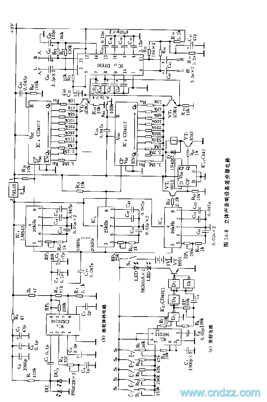 As the figure 14-8 shows, the remote controller is composed of the infrared ray coding emitter and the infrared ray decoding receiver. Figure (a) shows the 5-channel infrared coding emitter circuit. The astable multivibrator is composed of the 555 and C1, R6, R1 ~ R5, the oscillation frequency f=1.44/(R1-5+2R6)C1, the five channels are 10kHz,15kHz,20kHz,25kHz and 30kHz. The IC2 is the quad 2-input port NAND gate, the controlled oscillator is composed of the D1 and D2, the oscillation frequency f0=1/(1.4~2.2)RP1C3, f0 of the figure is about 38 to 40kHz. The infrared ray transmitting tube uses the SE303A or the HG4100 series tube. The receiver decoding circuit is composed of the infrared receiver tube, the special decoding circuit, the 5-channel single-tone decoder, the counting circuit and the stereo control circuit.etc.