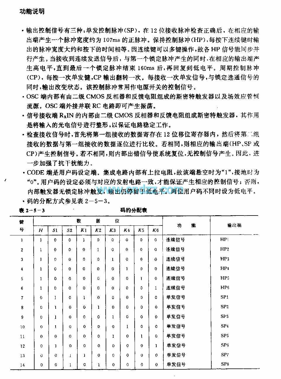 There are three kinds of output control signals: the single control pulse (SP), after the 12-bit receiving pulse is correct, the corresponding output port will produce a positive pulse with the pulse width of 107ms. if you maintain the control pulse (HP), when you press the continuous button, the output pulse width is equal to the press time. The HP signals can be synchronously parallel produced because the continuous key has the multi-key operation function, when it receives the continuous signal, the high level is produced by the corresponding output port.