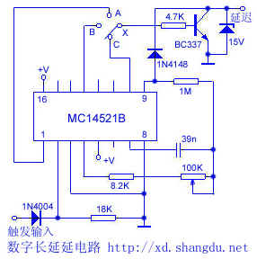 If X is connected to point A, the delay time is from 1 minute 40 seconds to 18 minutes 30 seconds, if X is connected to point B, the delay time is from 13 minutes 20 seconds to 2 hours 28 minutes. If X is connected to point C, the delay time is from a hour 47 minutes to 20 hours. The specific delay time is set by 100KΩ potentiometer. If it needs longer delay, you can use bulky capacitor insteads of 39nF capacitor. Then the delay time will reach more than one week. Added a positive signal on the trigger input terminal, the divider in 4521B can be reset.
