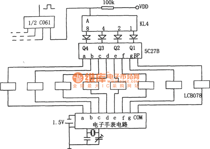 The field signal of the electric watch is voltage rising transformed by interface circuit LCB078 and then put into 5C27B field / BCD decoder. The signal is encoded as binary-decimal BCD code which is compared with the preset time signal consists of swich KL4.When the two are the same , high voltage output by main circuit will make the flip-flop to turn,and the relay drives the related load to work. When they are different , the main circuit output low voltage and the related load will not work.If it need to time several times, Multiple dial switches can be used in parallel connection.