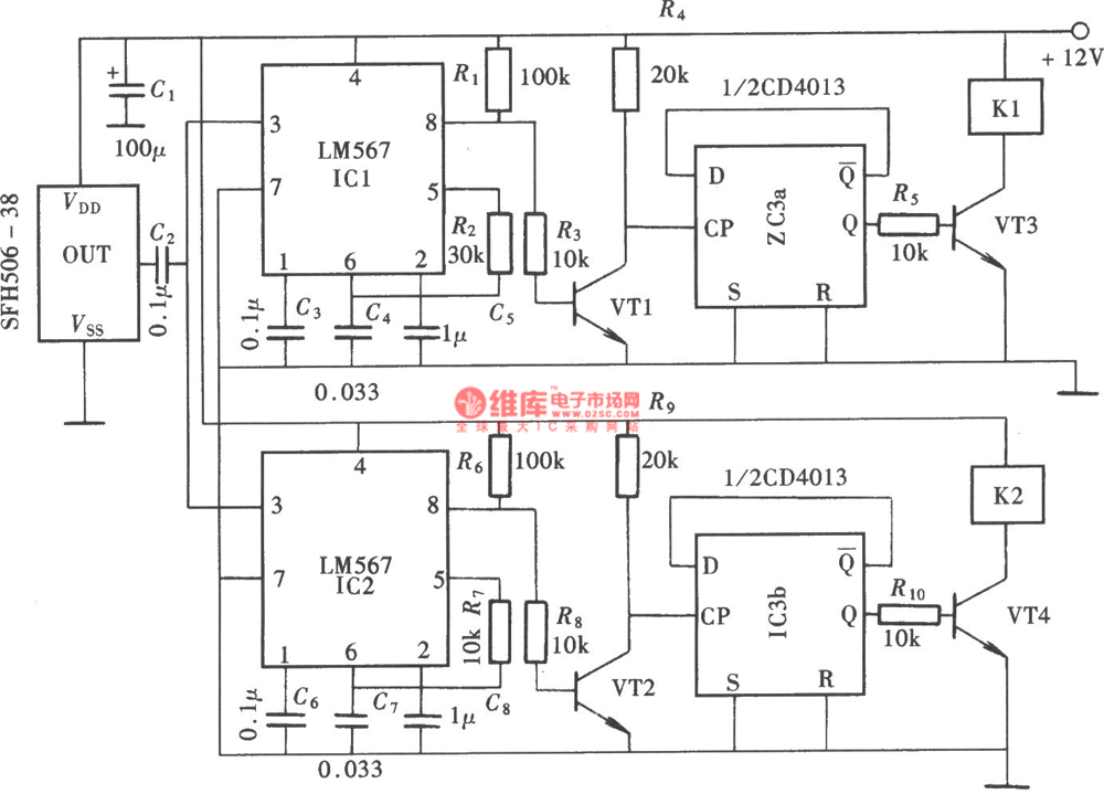http://www.seekic.com/circuit_diagram/Remote_Control_Circuit/Double_channel_infrared_remote_control_switch_LM567_CD4013.html