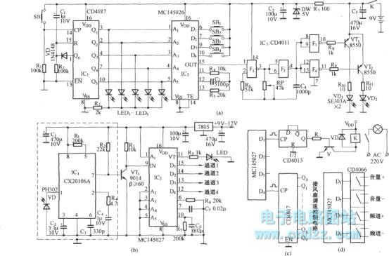 The circuit is translated and edited by MC145026. (a) figure is the remote control transmitter (b) plan is the infrared receiver and decoding circuit (c) Figure shows the controllingcontent which can be connected to each data outputend. (d) graph shows the circuit which the four data ports of MC145027topass four analog switch circuit CD4066and control the volume of an audio amplifier and speakers.
