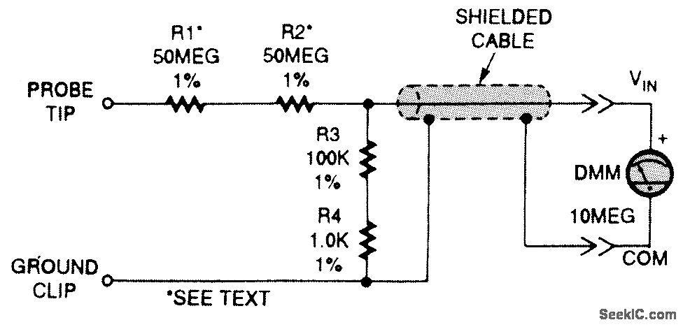 This high-voltage probe allows your DMM to take high-voltage measurements to 10,000 V peak, and acts as a high-impedance (100-MΩ) probe for high-impedance circuit testing. The probe was designed to plug into a standard 10-MΩ input DMM. If your DMM has a different input, you can change R3 and R4 to suit it. The ratio of R1 + R2 + R3 + R4 should be exactly 1000 to 1; thus, a 10.00-V in-put will read 10.00 mV on your DMM. Keep in mind that the impedance of your DMM is in parallel with R3/R4 when you calculate new values.