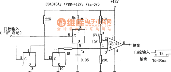 As shown in the figure is a high-precision delay timer circuit. In the figure, Rt, Ct are timing elements, with timing time T being RtCt (s). Changing the values of Rt, Ct can adjust the time of timing, but by doing so, the stability will get worse, so, usually it is achieved by adjusting the comparative level of the comparator, that is to say, by adjusting RV1 in the figure.