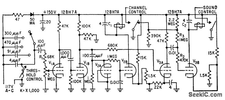 Can be considered as two separate receivers, one detecting unmodulated power-line carrier for channel selection, the other detecting hoth modulated and unmodulated carriers for sound-muting relay. Four individually tuned frequencies (52.5, 57.5, 67.5, und 73.5 kc) ate selectable by switching additional capacitors across that for highest frequency.-J. R. Banker and C. H. Wood, Jr., Line Current Controls Remote Tv Receiver, Electronics, 31:33, p 68-69.