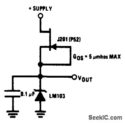 This simple reference circuit provides a stable voltage reference almost totally free of supply voltage hash. Typical power supply rejection exceeds 100 dB.