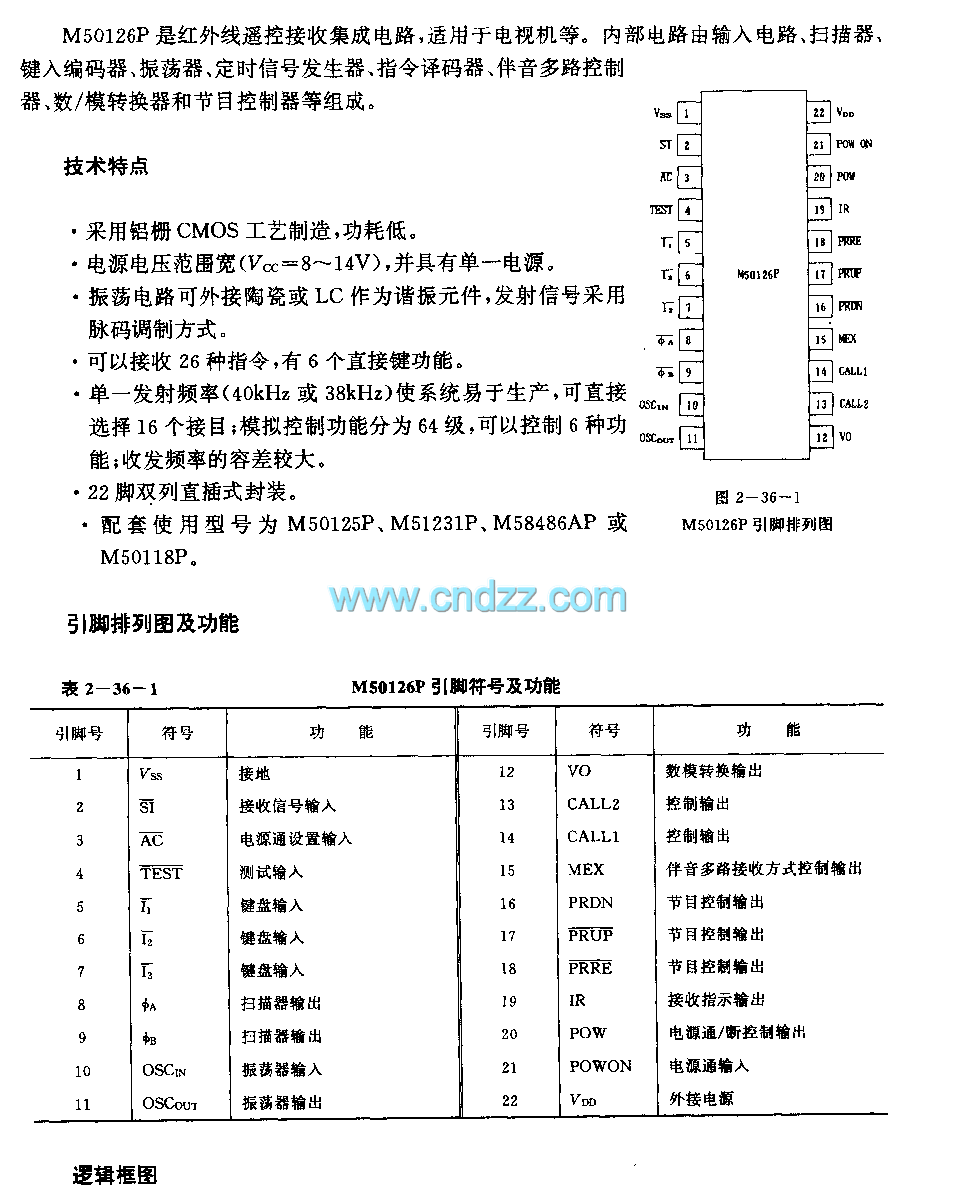 It uses the aluminum-gate CMOS process, the power consumption is low;The voltage range of the power supply is wide, and it has the single power supply;The oscillation circuit can connect with the ceramic or LC as the resonant component;The good anti-noise performance;It can receive 26 kinds of instructions, and it has 6 direct button functions;It can be used with the M50125P,M51231P and M58486P, M50118P;It is in the 22-pin dual-row DIP package.