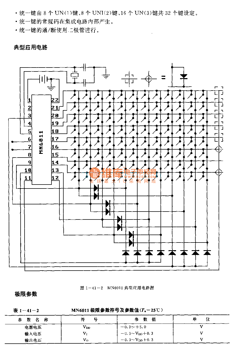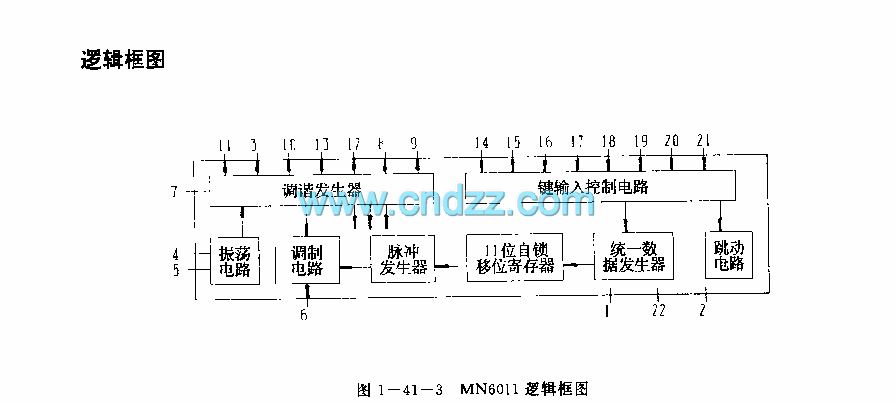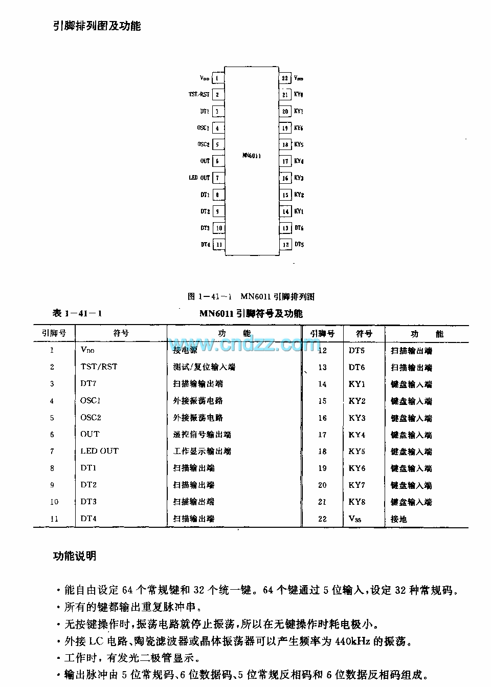 The MN6011 is designed as one kind of multi-function infrared remote control transmitter integrated circuit, and it can be used in the VCR. The internal circuit is composed of the oscilation circuit, the key input control circuit, the tuning generator, the pulse generator, the modulation circuit, the 11-bit self-locking shift register and the unified data generator.