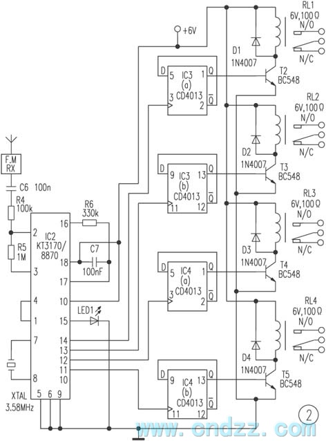 The receiving part is composed of the DTMF/BCD transform chip IC2 and a group of four trigger latch circuits IC4, IC3. The FM DTMF signal is demodulated by the receiver to change into the BCD signal. At this time the numerical code 1 is the 0001, the numerical code 4 is the 0100.