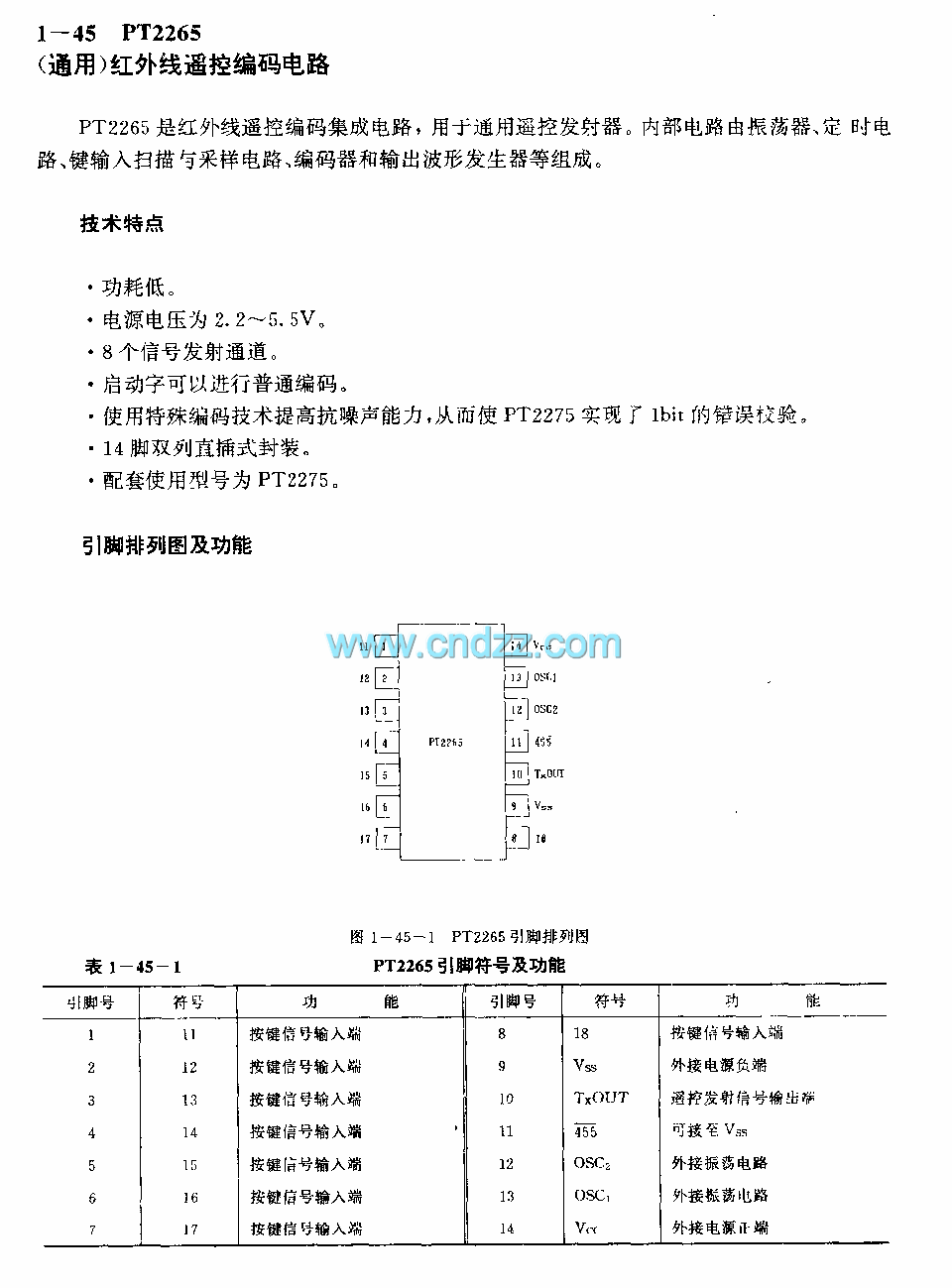 The low power consumptionThe power supply voltage is 2.2-5.5VEight signal launch channelsThe start word can be encodedThe special coding techniques to improve the anti-noise ability14-pin dual-row DIP packageThe matching model is PT2275.