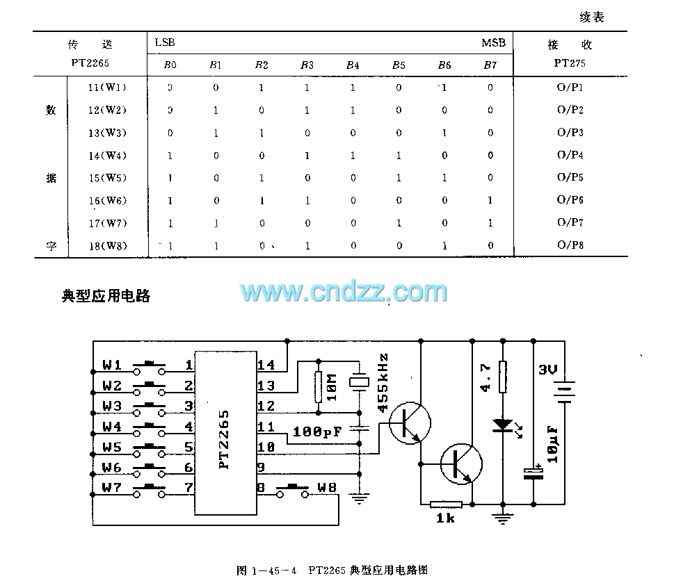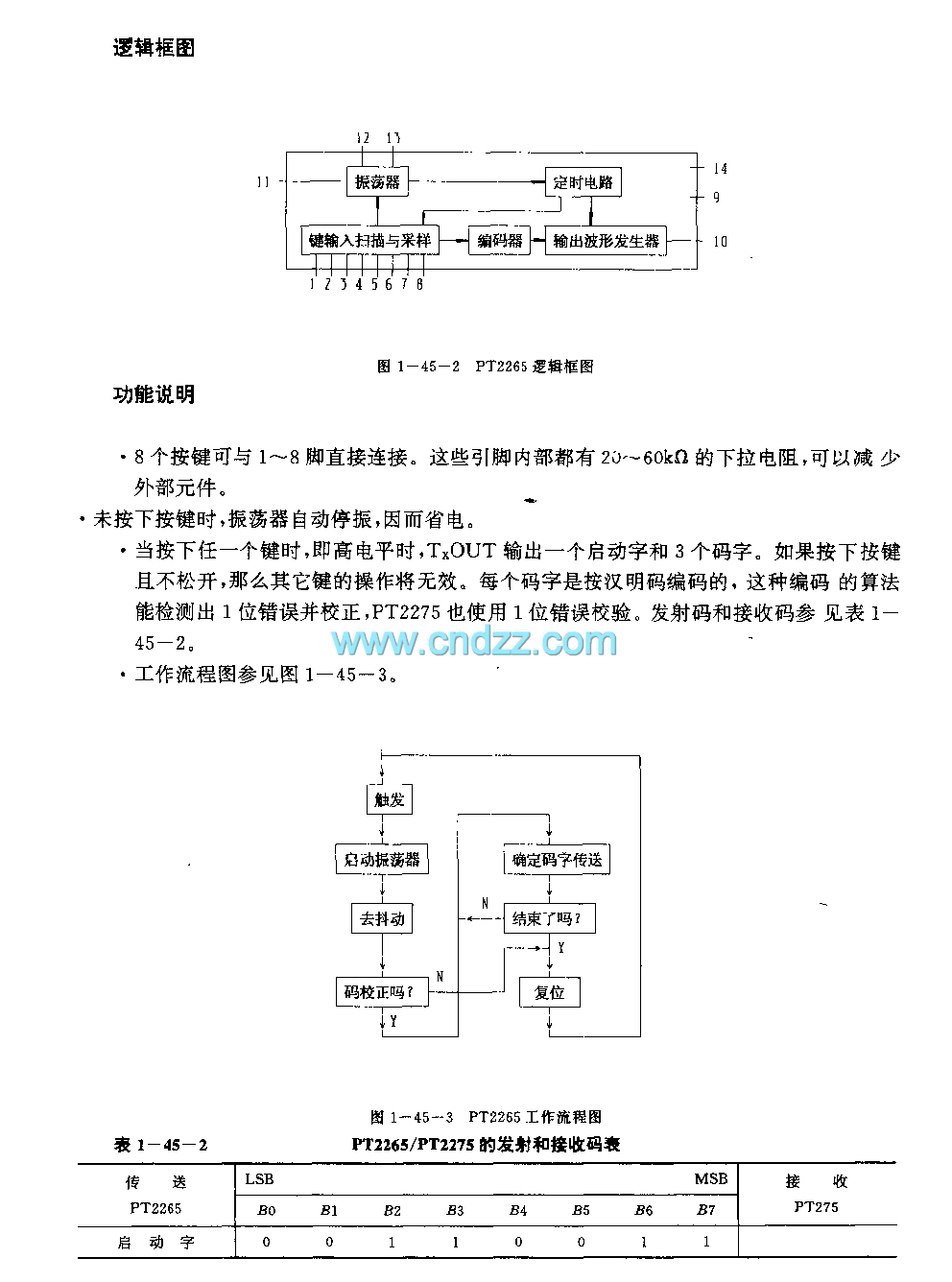 The PT2265 is designed as one kind of general infrared remote control coding circuit that can be used in the remote control transmitters. The internal circuit is composed of the oscillator, the timing circuit, the keyboard input scanning and sampling circuit, the coder and the output wave-form generator.