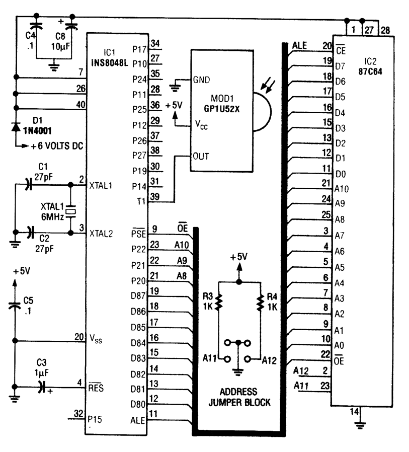 This circuit is based on the Sharp GP1U52X IR module and INS8048L microprocessor. The GP1U52X is a hybrid IC/infrared detector that provides a strong clean signal for later filtering and demodulation.