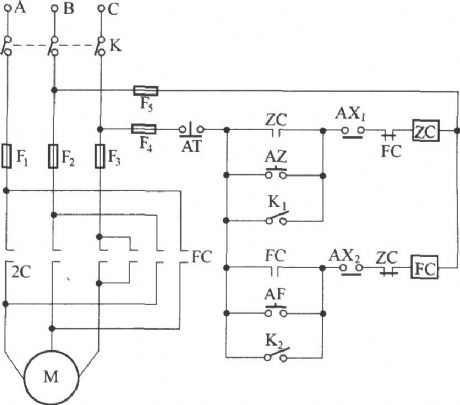 The circuit controlling three-phase motor forward and reversing rotation is shown as below.