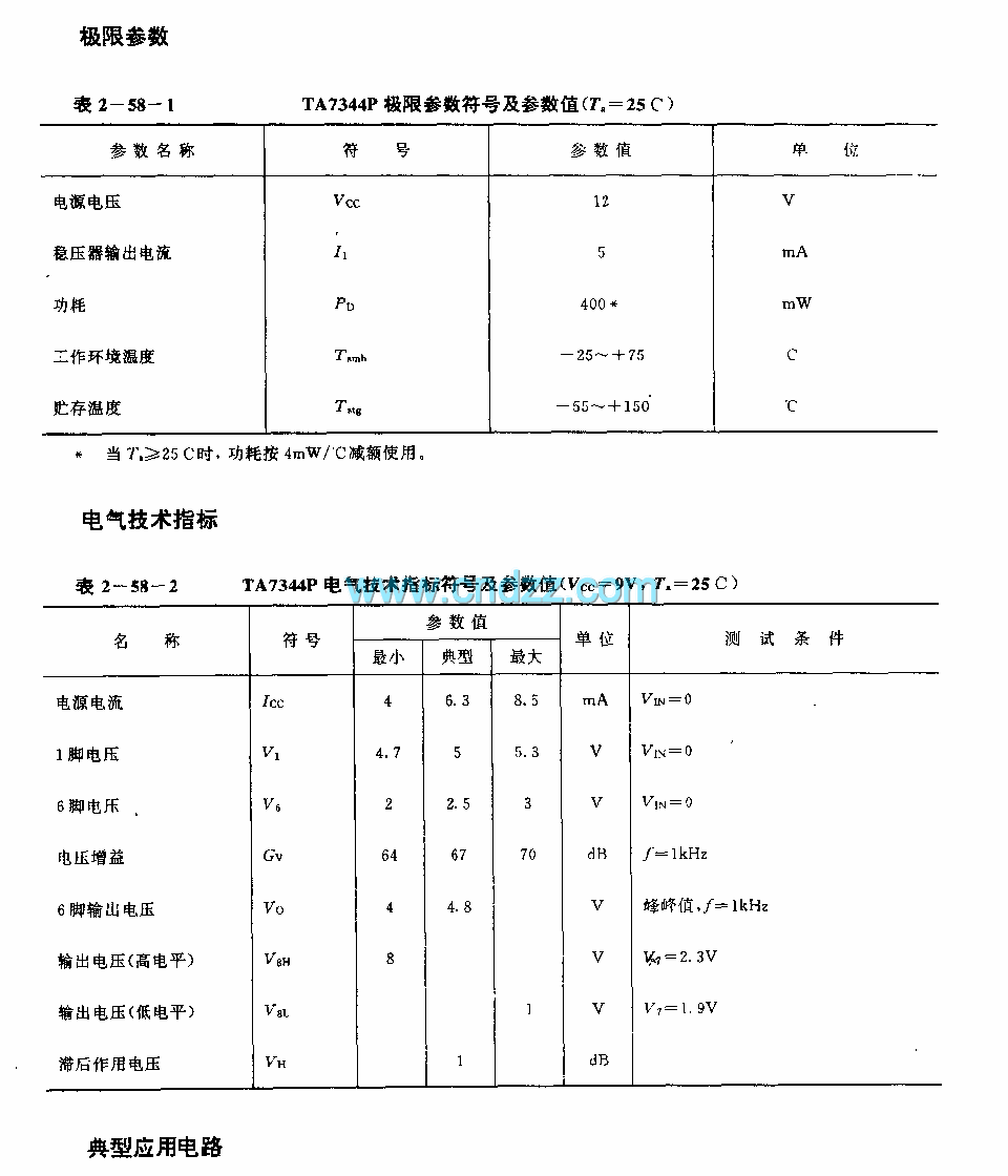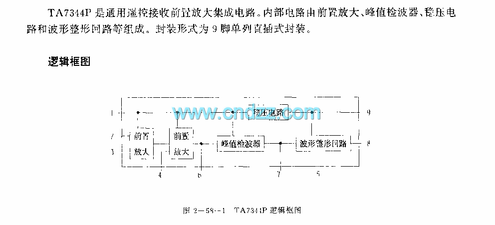 The TA7344P is designed as the general remote control receiving preamplifier circuit. The internal circuit is composed of the preamplifier circuit, the peak value detection circuit, the voltage stabilization circuit, the waveform plastic loop. It is in the 9-pin single row DIP package.