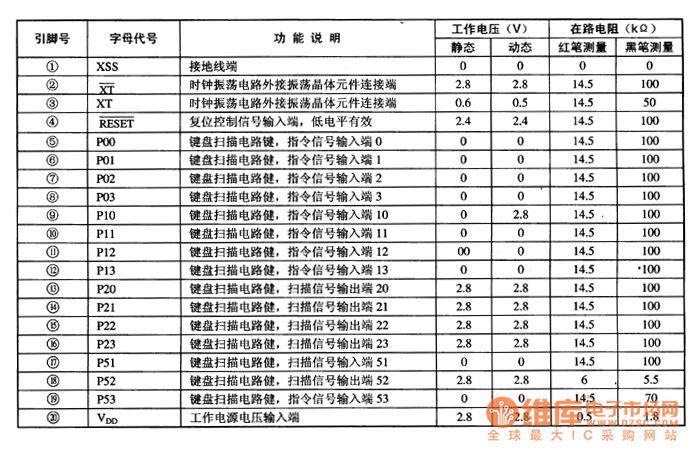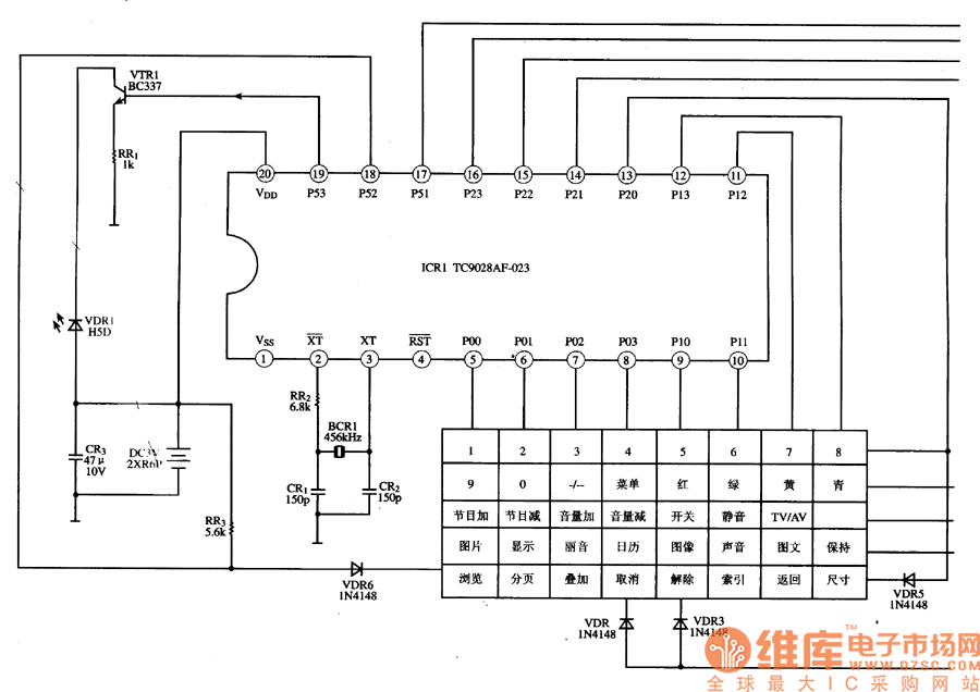 TC9028AF-023 is the integrated circuit of the remote emitter produced by Toshiba, which is widely used in the remote control system of large screen color TV.1.function featuresTC9028AF-023 contains clock oscillator circuit, reset circuit, key scanning encode circuit and other additional circuit.2.pin functions and dataTC9028AF-023 is in 20-pin dual line plastic package, whose pin functions and data are listed in Table 1.Notes:in the 2-pin and 3-pin of TC9028AF-023, the oscillator circuit and the external pottery resonator form a clock oscillator circuit.