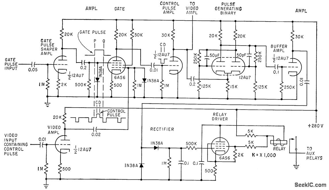 Control pulses transmitted in blanking interval by tv network transmitter are decoded by receiver circuits shown and translated into six different switching actions used to introduce special program matter such as commercials, weather reports, and local film projector material that may be different for each network station.-K. Kazama and T. Ishino, Remote Tv Control by Blanking-Interval Pulses, Electronics, 33:20, p 79-81.