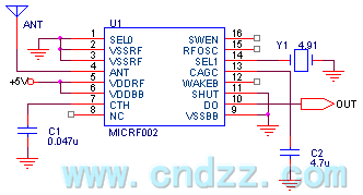 ICRF002 uses ceramic resonators to replacethe different resonator. The receiving frequency can cover 300-440MHz. MICRF002 has two operating modes: scan mode and fixed mode. Scan mode accepts bandwidth of several hundreds of KHz. This mode is mainly used to support the use of LC oscillator transmitter. Because LC transmitting frequencyis higher. In the scan mode, the data communication rate is 2.5K Bytes per second. Bandwidth of fixed pattern is only a few dozens of KHz, and it uses this mode for the supporting of transmitter crystal frequency. Stabilization data rates is up to 10KBytes per second. In addition, the use of wake-up function can wake up decoder or CPU. It can minimize the power consumption. MICRF002 is a complete single-chip superheterodyne receiver circuit. It basically realizes the antenna input after data directly output . Generally the receiver distance is 200 meters.