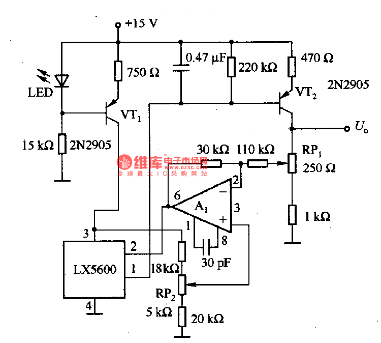 This is the temperature connector circuit of LX5600. In the circuit, LED and VT1 compose the constant current circuit, which provides with working current of LX5600. VT2 is the low output impedance amplifier, which magnifies the output signal of LX5600; A1 is the phase reverser, which completes the backward feedback; RP1 is used to regulate the converting sensibility; RP2 is used to zero set. The output voltage is 0-5v, the temperature of 100℃ is corresponding to the voltage of 4V.