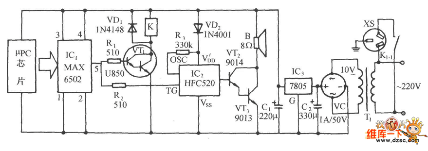 The figured circuit consists of the temperature detection switch, relay control circuit, language circuit, audio power amplifier circuit and AC step-down rectifier circuit, etc. When the temperature of the object or machine is over the set value, the outlet XS gets power and the ventilating or cooling device connected with the outlet is running. At the same time, the sound circuit is triggered and making sound, reminding people of the temperature change.