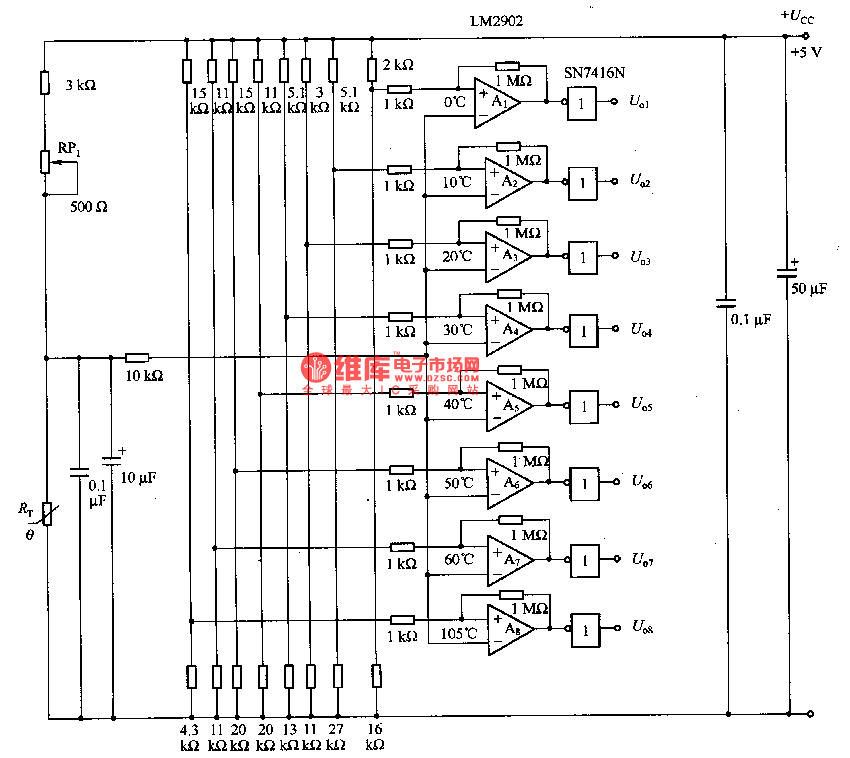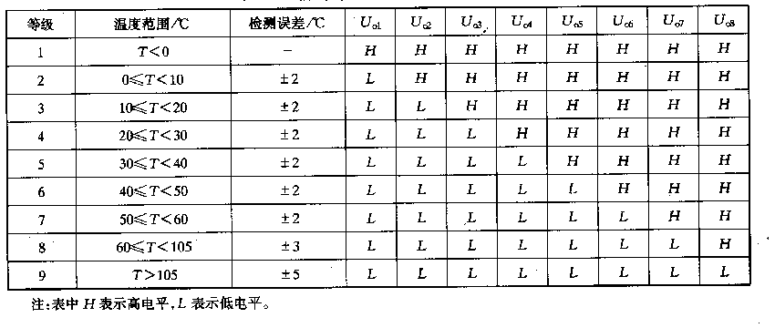 The figure is a temperature test circuit with thermistors. In the circuit, thermistors are used as the temperature sensor RT, the testing temperature is divided into 9 levels. By using comparators of Al一A8, the output high-low LEV represents the tested temperature. The relationships between LEV output by U.I-U.8 and temperature are listed in the table.
