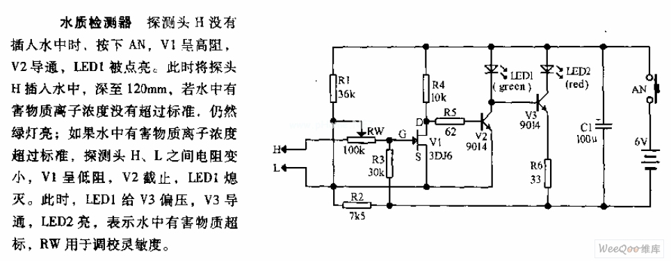 Water Quality Detector Circuit: When the detecting head has not been inserted into the water, if one presses AN, V1 will display that the impedance is high, V2 will break over and LED1 will be lightened. Once inserting the detecting head into 120mm deep under the water, the green light will still be on if the concentration of ions of harmful substance has not exceeded the standard. If not so, the impedance between detecting head H and L will become smaller. Then V1 will show low impedance, V2 will cut off, and LED1 will go out. At this time, LED1 will offer bias voltage to V3 which will break over afterwards. And LED2 will be lightened, indicating harmful substance in the water has exceeded the standard. RW is used to adjust the sensitivity.