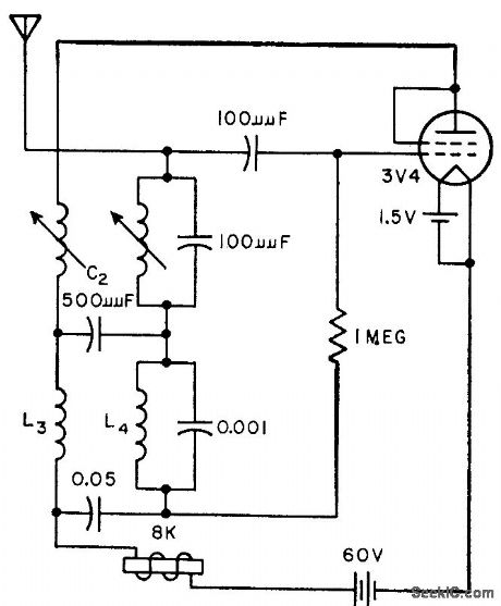 Well-known in model-control field for its reliability. With self-quenching, optimum performance is obtained when receiver is in weak oscillatory slate and incoming signal causes oscillation every third quench cycle. Provides large decrease in plate current when signal arrives.-S. J. Neshyba and F. E. Brooks, Jr., Stable Receiving Circuits for Remote Control, Electronics, 31:31, p 74-76. (View)