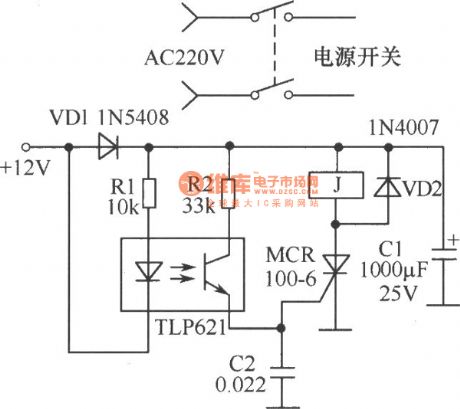 Photoelectric coupling type TV remote control and shutdown circuitis shown in the diagram. 12V powerin the circuitisfrom the control switching power supply controlledby remote control circuit in the machineor +12V voltage output terminal produced by line circuit. After starting up, + 12V voltage chargeto C1 through the VD1.Optical coupler internal light emitting diodes is cut-off state, so the thyristor is not conductive. The power switch is self-locking and TV works normally.