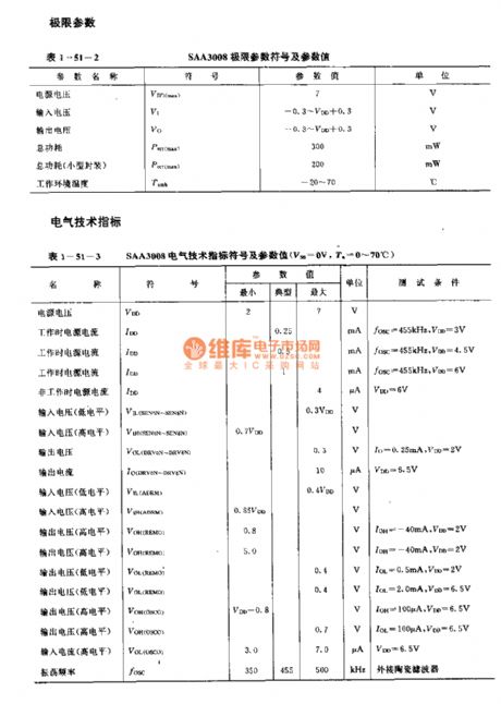 The little external components.The wide external power supply voltage range, the value is 4-6.5V.The oscillating circuit has the external ceramic filter. The typical value of the reference frequency is 455kHz, the carrier-wave frequency is 1/12 of the reference frequency.In the non-operating state, the power supply current is very small, the value is lower than 4uA when VDD=6V.It has 20 groups of subsystem addresses, every subsystem has 64 instructions.The SAA3008P uses the 20-pin dual-row DIP plastic package, the SAA3008T uses the 20-pin small size plastic package.The matching model are TDA3048, SAA3009 and SAA3049.