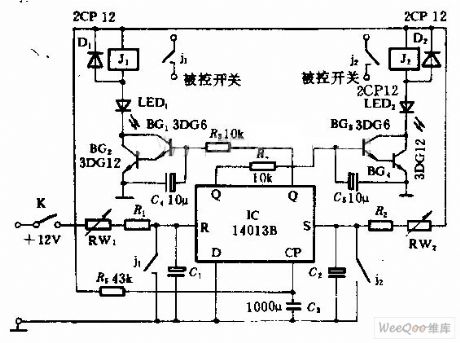 This circuit can periodically control two switches in turn, the control time ranges from several seconds to dozens of seconds freely;when it is used a forward and reversely moving machine control, it can make the motor periodically move back and forward accordingly.