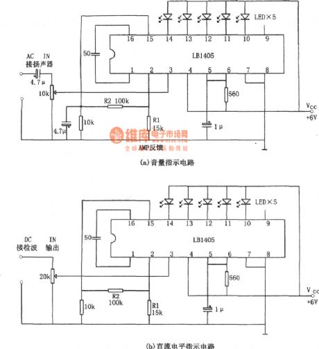 As shown in the figure is the LB1405 / LB1415 level instruction drive circuit. Figure (a) is an application circuit of LB1405 / LB1415 used as volume instruction, and figure (b) is an application circuit of LB1405 / LB1415 used as dc level instruction. The corresponding closed-loop gain of figure (a) is R2 / R1.Adjusting the 10 kΩ potentiometer will get the point of 0 dB. In the circuit, five stick leds are used to indicate the level of input signal. (View)