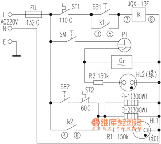The Keling ZTP-63A type dual function tableware disinfector cabinet is dual door and dual room structure. It has many advantages such as thorough disinfection, no pollution, sage and stable, easy to use, and so on. This artical intruduces this disinfector cabinet's working principle and common faults' repairing methods for repairing reference.The working principle is intruduced below.This disinfector cabinet's circuit is drawn and shown in the picture. The full circuit is made up of three parts which are high-temperature disinfector circuit, temperature-keeping circuit and ozone disinfector circuit. In the high-temperature disinfector circuit, when it is connected to the power and the user presses the disinfector switch SB1, the relay K would get electricity and become closed. And the normally open contactor K1, K2 are closed to be connected. Then the working indication lamp (red) HL1 would light.