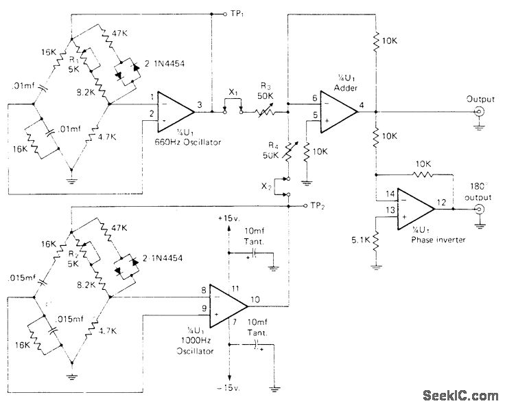 Produces two audio frequencies with all harmonics and cross products down 40 dB or more, as required for accurate testing of amateur SSB equipment. Two sections of Raytheon 4136D quad opamp serve as Wien-bridge audio oscillators, one at 1000 Hz and one at 660 Hz. Silicon signal diodes in each bridge act as nonlinear stabilization elements. Third section of opamp adds sine waves, and fourth section is simple inverter with gain of n for push-pull or balanced output. With all four pots at midvalue, adjust R2 for 12 V P-P at TP2 and adjust R4 for 12 V P-P at TP2. Open X2 and adjust R3 to give 12 V P-P from either output terminal to ground, then close X2 and repeat for X1 and R4. Output should now be 660 and 1000 Hz added linearly as required, with no cross-products. Use regulated ±15 V supply.-H. Olson, A One-Chip, Two Tone Generator, CQ, April 1974, p 48-49.