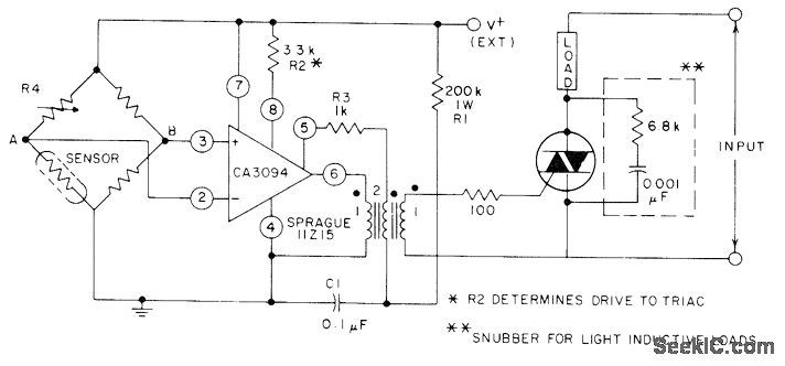 CA3094 programmable opamp is connected as level-triggered MVBR at output of bridge, driving triac for temperature monitor or control applications. Sensor can be any temperatu re-depend ent device. Load can be lamp, horn, or bell. For control applications, load is appropriate temperature-controlling device connected in feedback relationship to sensor.- Circuit Ideas for RCA Linear 'ICs, RCA Solid State Division, Somerville, NJ, 1977, p 10.