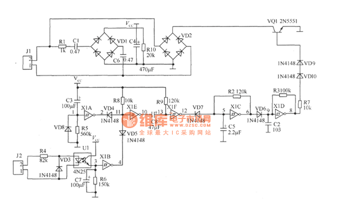 The work principle of the circuit: in the circuit, J1 is connected to the telephone line. When there is no call in, Vcc is 0V for there is no ringing signal. The circuit does not work with no power source voltage. When there is call in, the ringing signal is current limited by the R1, through C1, C6 coupling, bridge VD1 rectifier, C4 filter to supply power voltage Vcc for the whole device. By detecting, Vcc changes from 1.8V to 4.2V with ringing signal, but it does not affect the function.