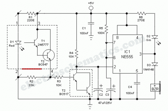 Industrial grade clear glass sensor modules are widely available but not within the reach of an average electronics hobbyist. The simple clear glass sensor circuit can be used for experiment/hobby purposes. The concept is very simple and is based on a home-made sensor unit comprising one high efficiency ultra bright red LED (D1) and a standard phototransistor 2N5777 (T1). The circuits works off a well regulated 5Volt dc supply.When power is turned to ON, light transmitter D1 starts emitting visible red color beam towards outside through a red colored filter glass. If a clear glass is placed in front of it,within 1-5 mm, light from D1 is not highly reflected. So T1 does not conduct and the monoshot wired around IC1 (NE555) is in standby state. This condition is indicated by the green LED (D2).However, in case of some (not all) unclear/colored/labelled glass material, reflected red light from it turn on the phototransistor T1 and IC1 is triggered by this action. Immediately D2 goes off and the piezobuzzer starts beeping for a short duration (near 5 secs with R5, C3 values shown). This acoustic sounder can be replaced with a 5V/600 Ohm relay to control external loads. Remember to add a freewheeling diode (like 1N4148) across the relay coil in antiparallel to suppress the counter emf generated during relay switching.