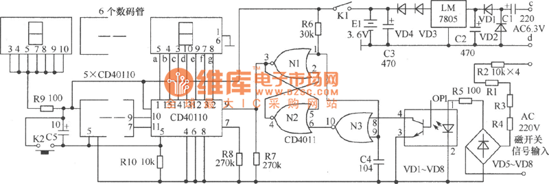 As shown in figure,the original mechanical counterjust has two magnetic switch signals terminals, while electronic counter increases input terminal c,d of AC6.3V,and thereare 4 binding posts. C1,C2,VD1,VD2 form voltage-multiplying circuit,filter circuit,and output 5V stable DC voltage after voltage stabilization,and become about 3.6V DC voltage after voltage reduction by VD3,VD4.E1 is a small Ni-cd rechargeable battery.When the mains supply is available,the supply will charge E1;and when the supply stops,E1 will charge the load to maintain the value of the counter.VD3 and VD4 here have an effect of insulation. When input magnetic switch at the both end of a,b closes,the AC 220V voltage is connected.The voltage will be converted into AC pulsating voltage after it is reduced by R1~R4 and bridgedioded by VD5~VD8.And the AC pulsating voltage provides luminotron of the photo-coupler with voltage after it is limited by R5 to make luminotron glow. The resistance of photosensitive tube will decrease because of light and generate a decline pulse,which will reverse direction through N3.And the pulse offers power to trigger of N1,N2 and N1 will output count pulse. N1,N2,N3 constitute pulse shaping circuit together.