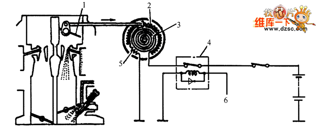 It is a electric automatic check door circuit diagram, it is fixed a PTC thermal resistor component on the electric check door, this control system is composed of bimetallic strip, electrical heating coil, choke valve relay. When it is lower than the set point of temperature, the choke valve is closed by bimetallic strip, then the starter begins to work, the choke valve relya contact is closed by the voltage of voltage adjuster L terminal, the current flows electrical heating coil, the temperature of bimetallic strip rises, after the temperature rising, the choke valve opens slowly. When the bimetallic strip is heated enough, choke valve opens fully, it uses thermal resistor to control the current of electrical heating coil.