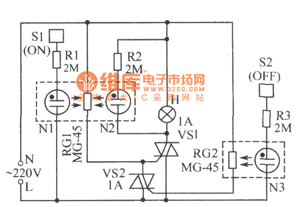 The circuit principle is as shown, the photoelectric coupler is composed of the neon tubes N1 and N2, the photoresistor RG1. When the hand touches the sheetmetal S1, the N1 turns on and the resistance of RG1 becomes small, so the two-way thyristor VS1 conducts because it gets enough trigger current, so the bulb H gets power to light. At the same time, the 220V AC voltage of H makes the N2 to light, this light is shining on the RG1, so at this time, even you stop touching, VS1 remains in the conduction state, and the H still lights. In the figure, the photoelectric coupler is composed of the neon tube N3 and the photoresistor RG2.