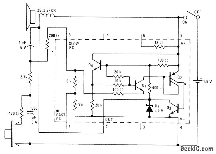 Low-drain circuit operating from 1.5-V cell uses National LM3909 flasher IC to simulate fire-alarm siren. Pressing button produces rapidly rising wail, with tone coasting down in frequency after button is released. Sound from loudspeaker resembles that of motor-driven siren. Volume is adequate for child's pedal car.-P. Lefferts, Power-Miser Flasher IC Has Many Novel Applications, EDN Magazine, March 20, 1976, p 59-66.
