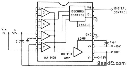 Channel 1 is wired as a conventional integrator, and channel 2 as a voltage follower. When channel 2 is switched on, the output will follow VIN and C will discharge to maintain 0 V across it. When channel 1 is then switched on, the output will initially be at the instantaneous value of VIN, and then will commence integrating towards the opposite polarity. This circuit is particularly suitable for timing ramp generation using a fixed dc input. Many variations, such as building programmable time constant integrators, are possible.