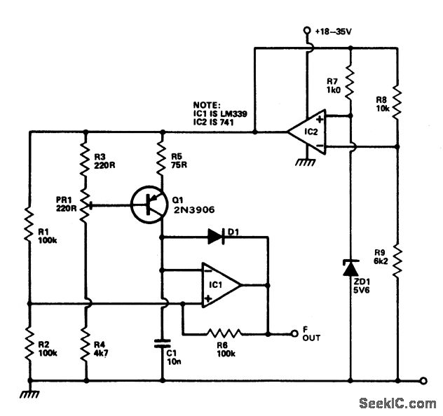 This circuit provides a linear increase of frequency of 10 Hz/℃ over 0-100 ℃ and can thus be used with logic systems, including mi-croprocessors. Temperature probes Q 1 Vb. changes 2.2 mV/℃. This transistor is incorpo-rated in a constant current source circuit. Thus, a current proportional to temperature will be available to charge C1. The circuit is powered via the temperature stable reference voltage supplied by the 741. Comparator IC1 is used as a Schmitt trigger whose output is used to dis-charge C1 via D1 To calibrate the circuit Q1 is immersed in boiling distilled water atad PR1 adjusted to give 1 kHz output. The prototype was found to be accurate to within 0.2 ℃.