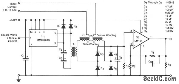 Line driver U1 excites the saturable reactor L1 by feeding a 2.3-kHz square wave through transformer T1. The output of L1 is rectified by the bridge rectifier composed of diodes D3 through D6, then amplified by op amp U2, which has a gain of 20.