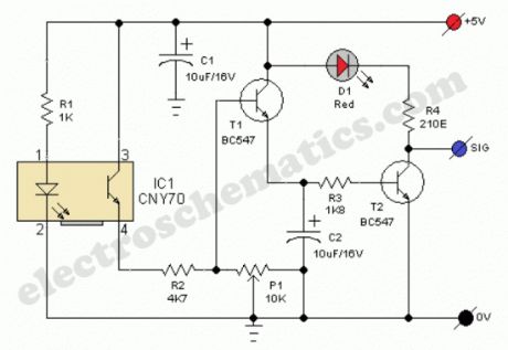 The red color LED (D1) is only a visual indicator. You can add a suitable (5V) reed relay in parallel with D1-R4 wiring after suitable alterations to brake/stop/redirect the robot. Similarly, the High to low (H-L) transition at the collector of T2 can be used as a signal to control the logic blocks of the robot. Resistor R1 determines the operating current of the IRLED inside IC1. The sensing ability largely depends on the reflective properties of the markings on the track and the strength of the light output from IC1.