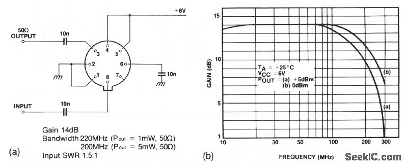 Figure 2-4A shows an SL560 used as a 50-Ω line driver. Figure 2-4B shows the typical frequency response.