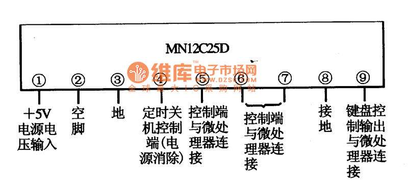 MN12C25D is memory integrated circuit produced by Matsushita, widely used in electronic products of Panasonic series, such as Panasonic color TV, air conditioning, DVD players and so on. 1. Features MN12C25D IC 's internal is mainly composed of the memory matrix, data and clock interface circuit, memory control circuit and other ancillary circuit. 2. Functions and data MN12C2SD IC is in 2.5 foot 9-pin single row of plastic package with its function as shown in the figure, and its operating parameters listed in Table.
