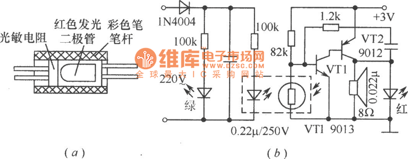 Combine the Φ55mm, red LED with photoresistance by transparent tape and put them in a pigmented penholder(black for good),and then seal both end,which has made a photo-coupler.Photo-coupler can applies to low frequency switch circuits ,just as shown in picture a.And picture b shows an outage alarm circuit adopting photo-couplers that can make an alarm if the electricity is not available.As usual,the red LED is ashine and the photo-coupler reduce the resistance of photoresistance through coupling.So,VT1 stops working,and the oscillator comprised by VT1、VT2 stops as well.When meet a commercial power cut, the resistance increases and makes VT1 connected,so that the oscillator starts to run,giving out a warning signal.
