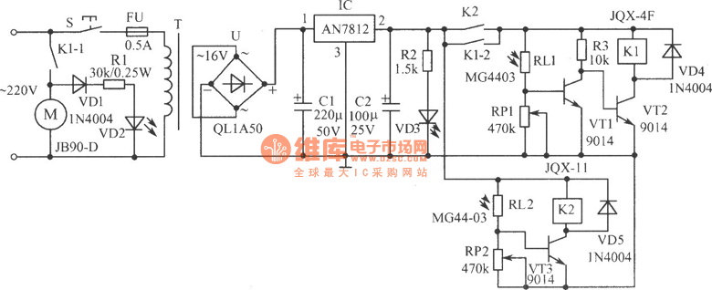 The materiel of electric mixer used in industrial and mining enterprises often has odors or dust,so the operators should not be too close.The light-operated electric mixer(or other electrical appliance) circuit shown in the picture can adopt ordinary flashlight as remote control commands, and it can control the electric mixer in 10m.The entire circuit can be put into plastic box,and it is easy to use in the field.Components selection: IC adopts AN7812 three-terminal regulator IC. VT1~VT3 use 9014 transistor.
