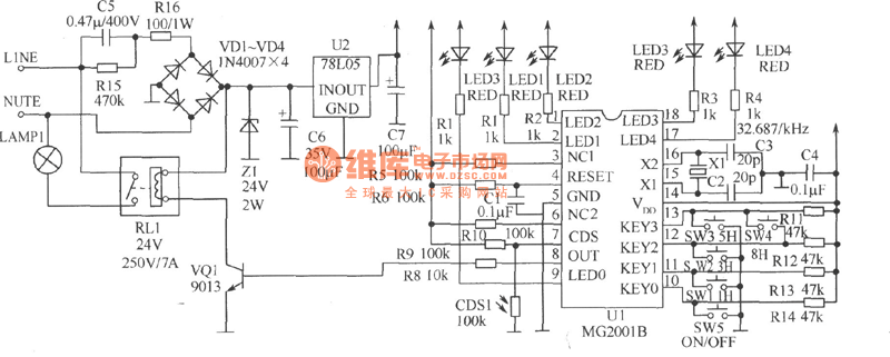 Door lamp isusually controlled by hands,which may make some waste of electrical energy and inconvenience if someone forgets to turn on or turn off.If it can increase light control and timing functions,it can achieve automation and energy-saving effect.The ready-made light-controlled timing ICMG2001B is a cheap 1h-36h,nine-gear optional timing,delay IC,and its peripheral circuit is simple ,and it is with driver of indicator light as well as interface of photoresistor.It adopts cheap 32.768kHz crystal as clock source whose order of accuracy will reach one over one hundred thousand.So it is suitable for automatical control circuit of street lamp.