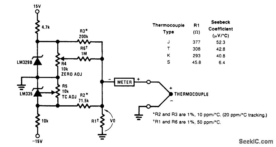 A circuit for use with grounded thermocouples is shown. To trim, short out the LM329B and ad-just R5 so that V°= αT, where cc is the Seebeck coefficient of the thermocouple and T is the absolute temperature. Remove the short and adjust R4 so that W equals the thermocouple output voltage at ambient. A good grounding system is essential here, for any ground differential will appear in series with the thermocouple output.